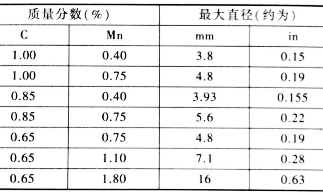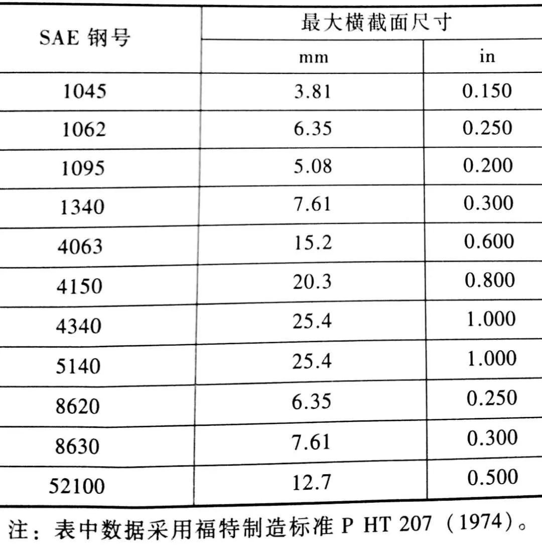 等溫淬火有很多優點,例如可使零件具有高硬度和高韌性,同時可減少變形和尺寸變化以及開裂。但是,等溫淬火冷卻介質不是對所有鋼都普遍適用的,其應用限制因素包括橫截面尺寸、鋼中含碳量等、表13~表15 中列出了對于不同鋼成分、合金元素類型,能做等溫淬火的橫截面尺寸及厚度限制的建議。這些建議中的最大直徑相當于在 315℃ (600°F) 的鹽浴中保溫時,其心部冷卻速度剛好能夠錯過鋼合金TTT曲線的“鼻尖”。