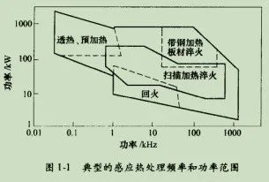 感應電源的主要參數是頻率和功率,熱處理應用的頻率范圍和功率大體上如圖1-1所示。