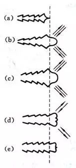 在循環(huán)荷載作用下,由滑移帶形成的微裂紋沿45o最大剪應(yīng)力作用面擴展,逐步匯聚成一條主裂紋,并由沿最大剪應(yīng)力作用面轉(zhuǎn)向沿垂直于最大拉應(yīng)力面擴展。
