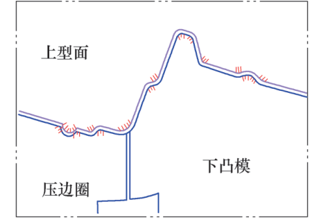 根據(jù)拉延模具成形的特點(diǎn),與板料接觸的凸R位置和板料流動(dòng)較大的面需要有高的耐磨性,即高硬度。如圖2所示,拉延模型面上的凸R一般都需要進(jìn)行淬火處理。