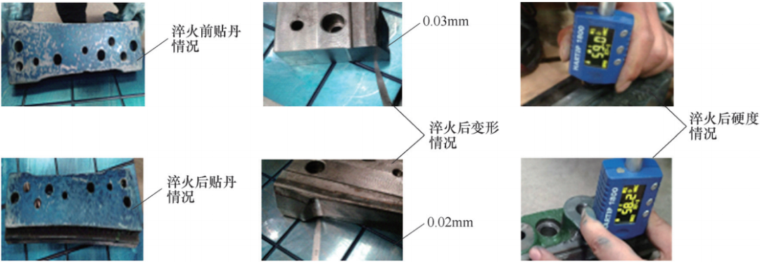 經(jīng)過(guò)研究和實(shí)踐,我們發(fā)現(xiàn)激光淬火可以有效地控制鑲件變形和硬度不合格的問(wèn)題。圖5所示是切邊鑲件和整形鑲件的激光淬火硬度情況和變形情況,從圖中可看出,鑲件采用激光淬火后硬度穩(wěn)定、變形很小,實(shí)現(xiàn)了精加工后淬火的制造工藝,有效提升了加工效率,節(jié)約了加工成本。
