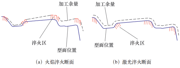 質(zhì)量的影響  相對(duì)于傳統(tǒng)淬火方式,采用激光淬火方式的模具型面變形很小、硬度均勻,因此工藝上采取型面精加工到位后再進(jìn)行淬火。圖6所示是采用火焰淬火和激光淬火方式的模具型面斷面。