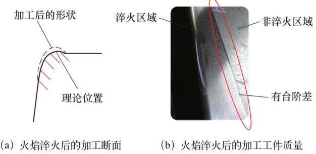 由于火焰淬火采用先淬火再精加工的方式,型面存在硬度不一致的區(qū)域,刀具在切削過(guò)程中存在受力不均、易磨損的情況,從而導(dǎo)致型面加工質(zhì)量較差,如圖7所示。