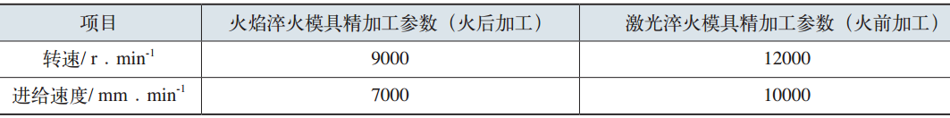 采用激光淬火的模具,淬火前型面精加工到位,這樣既避免了去變形加工工序,又提升了精加工的效率。以某機(jī)床為例,表2是采用火焰淬火方式和激光淬火方式模具精加工的參數(shù)情況,采用激光淬火方式的模具加工效率比采用火焰淬火方式提升了30%以上。
