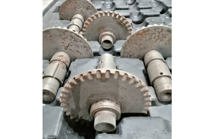 用于拋丸的產(chǎn)品是CVT無級變速器主動、從動帶輪及帶輪軸,工件材料為20CrMoH鋼(GB/T 5216—2014),工件硬度為58~64HRC。上機前狀態(tài)已經(jīng)滲碳淬火、回火,帶輪軸中心孔殘留少量淬火油。