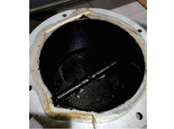 經(jīng)分析,因回火爐排氣管道垂直于爐子上方,拆開管路檢查發(fā)現(xiàn)接口處殘留油污,當油污直接流回回火爐時,經(jīng)過風(fēng)扇攪拌后掉落至工件表面形成油污點,如圖7、圖8所示。