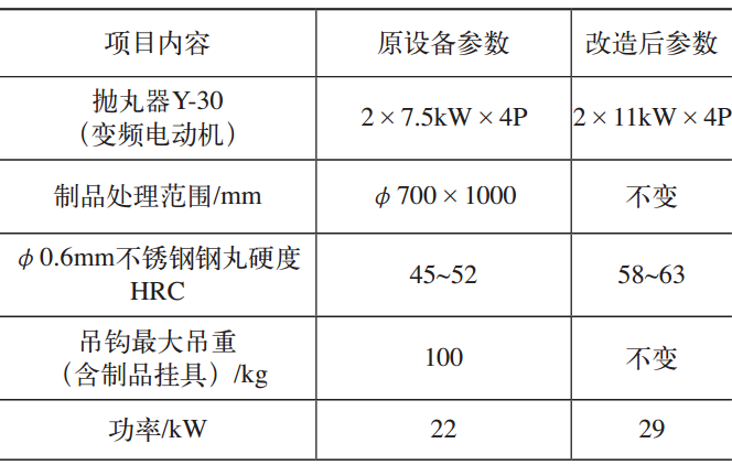 1)將拋丸器2個7.5kW的電動機更換為2個11kW的電動機,更換2個變頻器,更換帶輪、電器件等配件,使拋丸清理時間可縮短到節(jié)拍要求范圍內(nèi)。