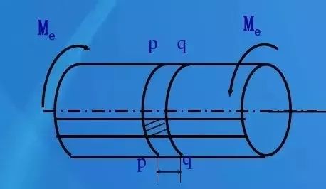 在軸表面作圓周線和縱向線,在扭轉力偶矩作用下,圓周線長度形狀不變,各圓周線間距離不變,只是繞軸線轉了一個微小角度;縱向平行線仍然保持為直線且相互平行,只是傾斜了一個微小角度。變形如圖所示。