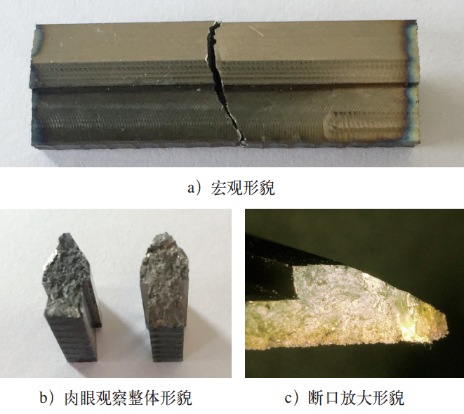 將斷口試樣從中間對半剖開進行金相分析,如圖3所示。觀察發現,右側斷口上部存在焊縫區域,下部有柱狀晶特征,左右兩側斷口上部及下部均存在一定的熱影響區,缺陷附近存在明顯焊接特征。