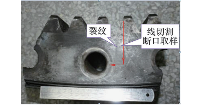 宏觀可觀察到軸承內圈螺栓孔附近有一條長約70mm的裂紋,從齒根向滾道方向擴展,未完全穿透整個軸承截面,如圖1所示。用線切割取出裂紋(斷口),經清洗后拍照,如圖2所示。從斷口宏觀形貌可以觀察到典型的貝紋線特征,表明變槳軸承為疲勞開裂。從貝紋線走向,可判斷疲勞源位于變槳軸承內圈輪齒的齒根處。