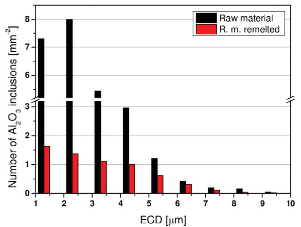 采用自動掃描電鏡/能譜儀(SEM/EDS)測定了原料的初始夾雜物形態,結果表明氧化鋁夾雜物是原料中主要的夾雜物類型。試驗的開始條件是將300g的原料放入氧化鋁坩堝中熔化,在1600°C的溫度下保溫10分鐘,然后冷卻。試樣制備后,另一種自動化的SEM/EDS測量顯示,原料中夾雜物的高比例存在于坩堝壁上,特別是在氣氛、鋼水和坩堝之間的三相區域點上。這是通過總氧測量確認的,該測量顯示重熔材料中總氧含量為17ppm。測量使用LECO?TC-300氧氮分析儀進行的。通過計算平衡條件,鋼的殘余鋁含量保證了溶解氧的含量相當低,大約為4 ppm。圖49對比了原料和重熔試樣中氧化鋁夾雜物的尺寸分布。
