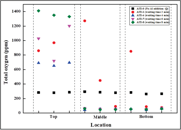 Al鎮靜的試樣中測量的全氧含量如圖51所示,作為參考,實驗AlTi-0顯示了沒有鋁鎮靜時的氧分布,樣品中的溶解氧均勻地分布在整個試樣體積上。