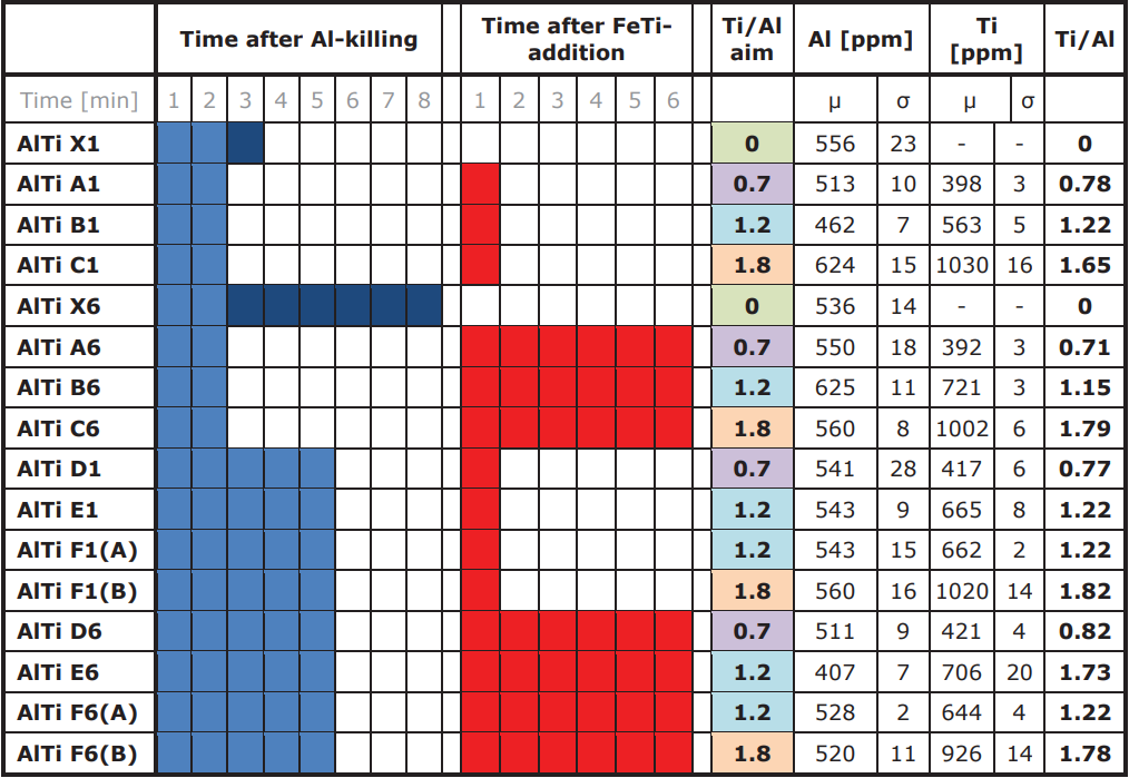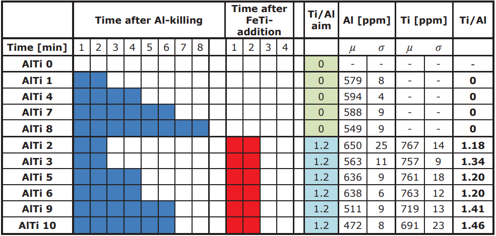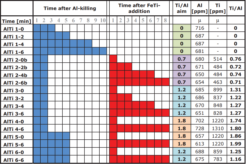 總共進行了22次試驗。變化的參數是加入了脫氧元素AlTi。為了調節夾雜物的數量,在脫氧和水口開啟之間的等待時間是不同的。