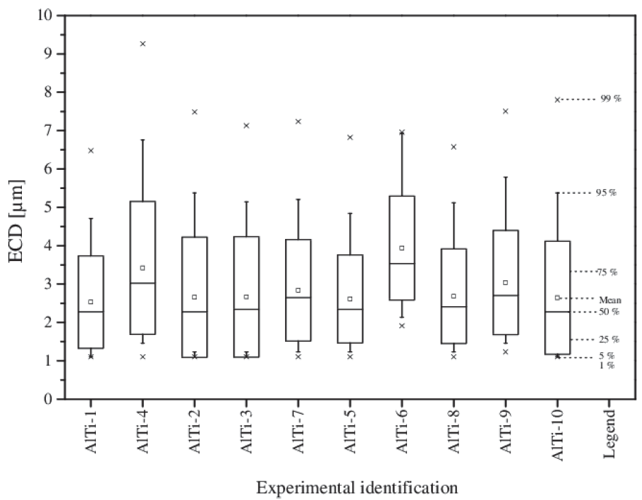 對比圖54樣品中氧化鋁夾雜物的當量圓直徑(ECD),只有AlTi-4AlTi-6的夾雜物略大于其他樣品,原因還沒有找到。一般情況下,在系列1中沒有發現添加Ti對夾雜物尺寸的分布有什么影響。