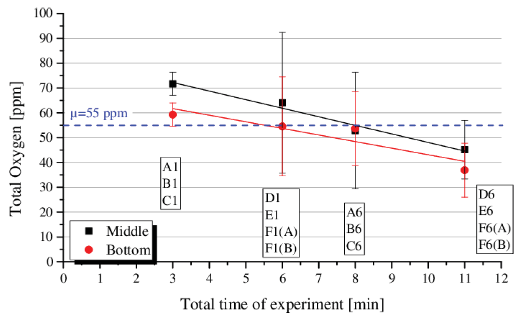 為確定實驗結束后的最終的全氧分布,分別從上、中、下三段再次切割試樣。盡管初始氧含量較低,但可以在頂部發現團簇夾雜物,這再次導致了結果的大范圍的波動變化。中間和底部截面的值再次顯示出較小的散射和一致的趨勢。隨著實驗時間的延長,氧化鋁顆粒的上浮行為導致Otot含量顯著降低,如圖55所示。添加不同量的FeTi75鈦鐵合金對全氧值影響不大。假設FeTi75鈦鐵合金的平均總氧含量為0.3%,最大添加量(Ti/Al = 1.8)將導致全氧增加3.9 ppm。