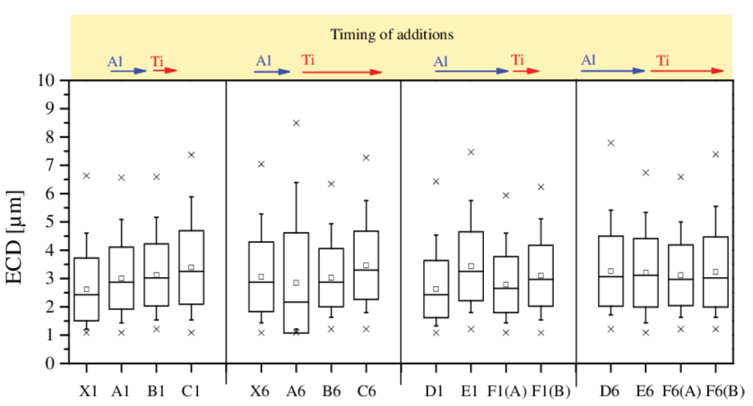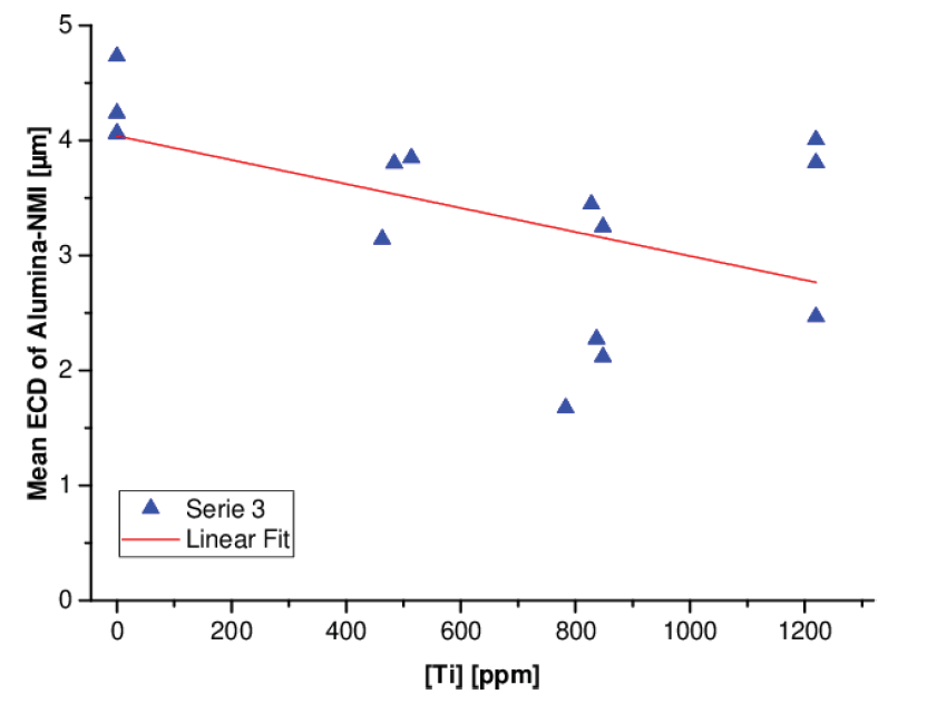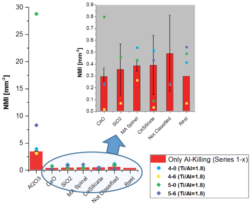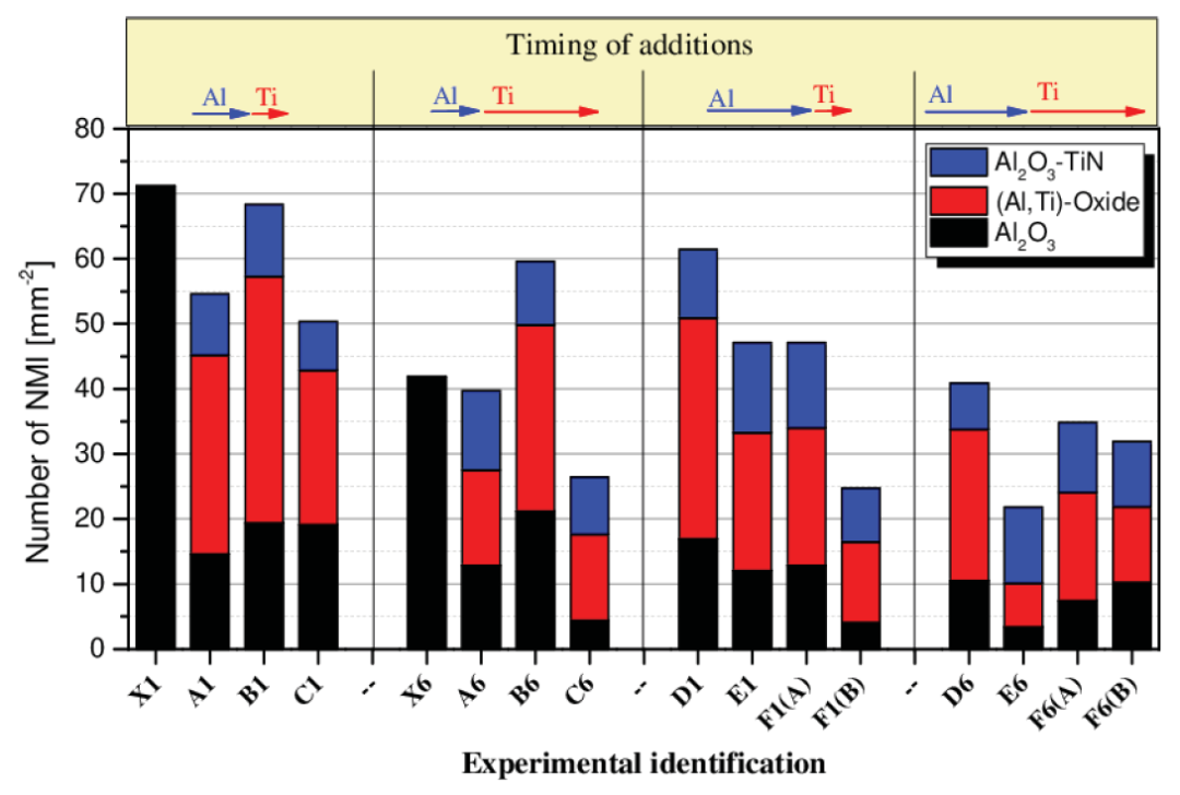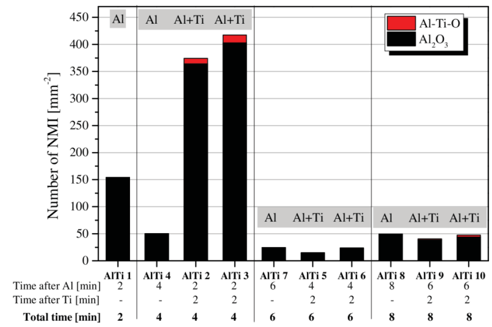 在較長的停留時間內,沒有觀察到添加Ti的影響。由于鋁鎮靜過程中形成的大量新夾雜物,來自FeTi75鈦鐵合金的相對較少的夾雜物數量不足以顯著改變檢測到的夾雜物總數。