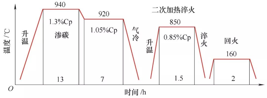 根據(jù)以上理論和實(shí)踐經(jīng)驗(yàn),我們認(rèn)為,常用的滲碳后直接淬火無(wú)法獲得所期望的碳化物形態(tài),故我們需要先對(duì)工件進(jìn)行滲碳,然后進(jìn)行低溫?cái)U(kuò)散,使得碳化物在擴(kuò)散和冷卻過(guò)程中能沿晶界析出,而后對(duì)零件重新加熱到淬火溫度并進(jìn)行長(zhǎng)時(shí)間的保溫?cái)U(kuò)散,使得前面工步中析出的碳化物更加均勻,然后進(jìn)行淬火硬化和回火。