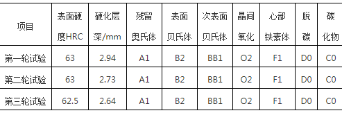 (2)產(chǎn)品圖樣僅有硬度和硬化層深要求(表面硬度≥60HRC,硬化層深2.2~2.8mm),圖樣標(biāo)注的特殊熱處理標(biāo)準(zhǔn)無(wú)法得到,我們對(duì)2批次的OEM分別進(jìn)行了抽檢,檢測(cè)結(jié)果如表3所示。