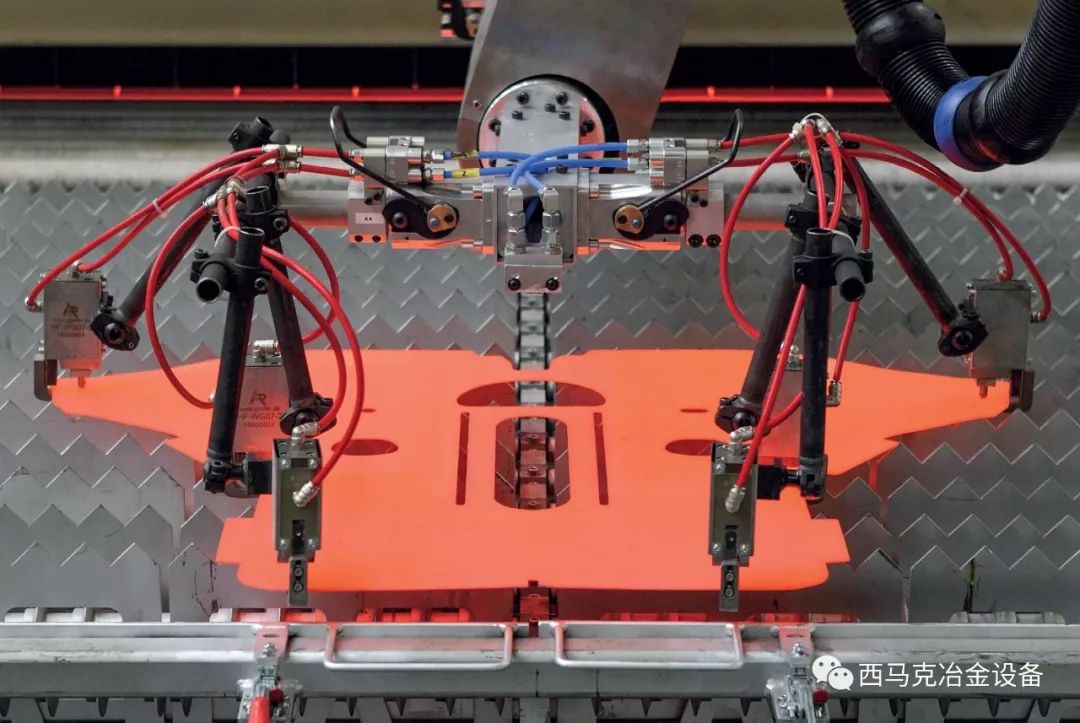 典型的模壓淬火生產(chǎn)線包含一臺傳統(tǒng)加熱方式的輥底式或步進梁式加熱爐,它將部件加熱到大約 950 攝氏度。其它組件還包括快速推頂和機械手處理系統(tǒng),確保以精準的周期對熱工件加載壓力。這種傳統(tǒng)設備理念在實際使用中獲得認可,但在某些方面并非沒有局限。在傳統(tǒng)加熱爐中進行加熱的空間需求是相對較高的。實現(xiàn)模壓生產(chǎn)線的常用產(chǎn)能會需要一個長的加熱區(qū),鋁硅防腐蝕保護層也要求一定的擴散時間。爐子里的大額材料數(shù)量同時也意味著:一旦發(fā)生故障,大量的成形板坯必會因表面氧化皮和防腐蝕保護層的燒損而被剔除報廢。