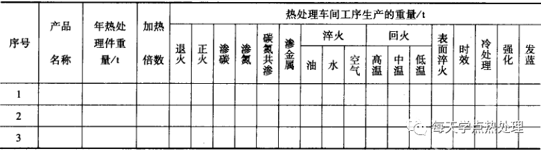 產品熱處理件數量、重量和零件熱處理工藝要求,同時結合產品特點、企業生產工藝水平確定的備(廢)品率計算出產品熱處理綱領,然后加上輔助專業提出的工具機修件數量(有協入件的熱處理車間還要加上協入件數量)綜合編制而成的。它決定了車間的規模,是確定工藝和選擇設備的依據。熱處理車間綱領以年生產重量(t/a即噸/年)表示,個別工藝如高、中頻感應加熱表面淬火件以年生產件數(件/a即件/年) 表示。在編制綱領表時,應將零件及工具、機修件等熱處理綱領分別列出,見表1 。