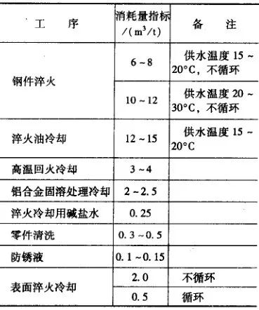 熱處理工藝操作的耗水量的計算,通常按工序每噸工件水消耗量指標作概略計算,如表29所示。車間用水應盡可能循環使用。