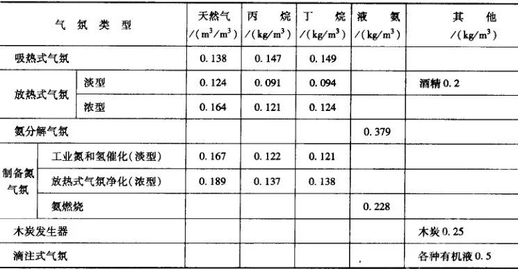 各種可控氣氛單位體積氣氛的原料消耗量見表32。