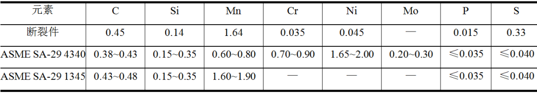 (2)化學(xué)成分分析 表1為斷裂件取樣的化學(xué)成分分析結(jié)果。該斷裂件各化學(xué)元素含量與ASME SA-29規(guī)定的4340鋼元素含量差異較大,且S含量顯著高于標(biāo)準(zhǔn)要求。經(jīng)與ASME SA-29比對發(fā)現(xiàn),斷裂件化學(xué)成分與該標(biāo)準(zhǔn)牌號為1345的鋼種較為接近。可見,設(shè)備供應(yīng)商提供的材料牌號與實際牌號不符,可能存在材質(zhì)錯用的情形。