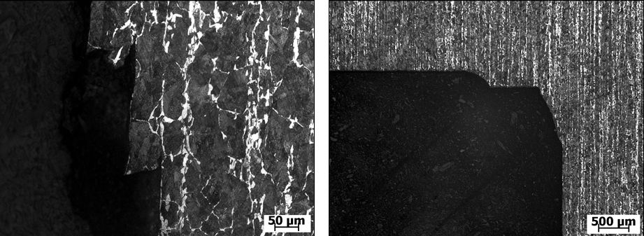 縱截面金相檢驗時還發(fā)現(xiàn),斷裂U形件在過渡圓角R位置的金屬流線不合理。R位置金屬流線被割斷,容易導(dǎo)致該位置應(yīng)力集中,也使得材料在R位置平行于槽底的方向上力學(xué)性能進(jìn)一步顯著降低。在U形槽的成形過程中,若能采用鍛造形式替代切削成槽的形式,可以改變R角位置金屬流線形態(tài),防止金屬流線出現(xiàn)斷流的情況,同時也能改善R角度過小容易導(dǎo)致應(yīng)力集中的問題,提高U形槽R位置的力學(xué)性能。