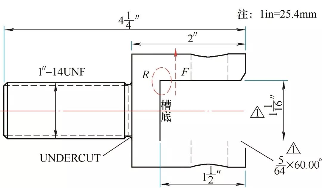 U形槽槽底平面與垂直于槽底平面的槽內(nèi)側(cè)平面之間的夾角R較小,兩垂直面過渡尖銳。查閱設(shè)備制造商提供的圖樣(見圖5)發(fā)現(xiàn),該產(chǎn)品在設(shè)計時并未對上述過渡角R進(jìn)行規(guī)定,而根據(jù)工件的實際使用工況可以判斷,該部件在安裝或使用過程中會不可避免地受到平行于U形槽槽底的分應(yīng)力F的影響,而尖銳的夾角極易造成應(yīng)力集中,導(dǎo)致U形槽在R位置破壞。因此可見,該零件同樣存在設(shè)計上的缺陷。