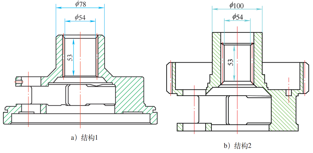 圖1是兩種不同結(jié)構(gòu)的行星架,材料為QT700-2,其內(nèi)花鍵頂圓直徑均為54mm,有效長度均為53mm,花鍵模數(shù)均為1.5875,壁厚分別是12mm和23mm。感應(yīng)淬火要求內(nèi)花鍵根部淬硬層深≥0.4mm,硬度≥45HRC,允許內(nèi)花鍵全長淬火。