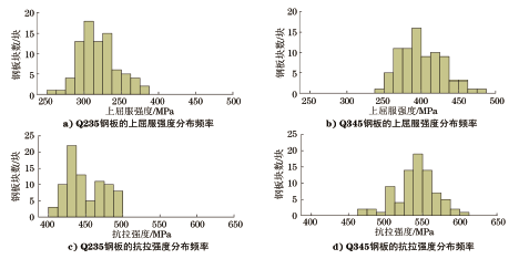 選取鋼結構工程中常用的Q235和Q345兩種牌號的鋼板作為研究對象。為了使樣品具有代表性,從江蘇省內86家鋼結構制造企業收集162塊鋼板,包括82塊Q235鋼板和80塊Q345鋼板,鋼板厚度規格為6,8,10,12,14,18,20,30 mm。 將鋼板加工成20mm×400mm的條形試樣,按照GB/T 228.1—2010的要求使用微機控制電液伺服拉伸試驗機進行拉伸試驗。把Q235鋼板和Q345鋼板的上屈服強度、抗拉強度的檢測結果分別進行統計分析,分布頻率如圖1所示。 圖1 Q235鋼板和Q345鋼板的強度分布頻率 從圖1可以看出,Q235鋼板的上屈服強度范圍為261~382MPa,抗拉強度范圍為404~497MPa;Q345鋼板的上屈服強度范圍為345~477MPa,抗拉強度范圍為473~607MPa。強度頻率分布基本成正態分布,檢測結果和日常委托檢驗經驗數據總體上是一致的,可以認為樣品具有很好的代表性。 2 試驗結果與分析 將試驗樣品按照標準要求進行取樣加工,分別進行洛氏硬度、維氏硬度、布氏硬度和拉伸試驗,按照最小二乘法原理,利用SPSS軟件對硬度與強度檢測結果分別進行回歸分析。 2.1 洛氏硬度與強度相關性 2.1.1 洛氏硬度試驗結果與分析 用砂輪機對試樣表面進行打磨,使試樣表面平坦光滑。選擇B標尺,用標準硬度塊對儀器進行校核后,按照GB/T 230.1—2018《金屬材料 洛氏硬度試驗 第1部分:試驗方法》的要求進行洛氏硬度試驗。每個樣品測3個點,取平均值。 圖2 洛氏硬度與強度的回歸分析圖 利用SPSS軟件對洛氏硬度與上屈服強度、抗拉強度分別進行線性回歸、二次方回歸、乘冪回歸和指數回歸分析,回歸分析圖如圖2所示,回歸結果見表1和表2。 表1 洛氏硬度與上屈服強度的回歸模型數據 表2 洛氏硬度與抗拉強度的回歸模型數據 從表1和表2可以看出,洛氏硬度與強度呈現較好的相關性,與抗拉強度的相關性優于與上屈服強度的相關性。洛氏硬度與強度關系的4種回歸模型中,顯著性P均小于0.05,擬合優度R2比較接近,考慮標準給出的低碳鋼洛氏硬度與抗拉強度之間換算關系接近于多項式模型,建議按照二次方模型進行換算,擬合后公式為 式中:ReH為上屈服強度;Rm為抗拉強度;HRB為洛氏硬度。 2.1.2 換算結果相對偏差分析 根據擬合的二次方回歸模型,分別計算出上屈服強度、抗拉強度換算值與拉伸試驗結果的相對偏差,并對相對偏差進行統計分析,統計量為162個,結果見表3,相對偏差基本呈正態分布,頻率分布如圖3所示。 表3 洛氏硬度換算為強度的相對偏差統計表 圖3 洛氏硬度換算為強度的相對偏差 2.1.3 與國家標準換算值的比較 將標準給出的抗拉強度換算值、擬合的二次方回歸公式換算值,以及洛氏硬度與抗拉強度對應關系的散點圖放在同一張圖上進行對比,如圖4所示。 圖4 各洛氏硬度換算的抗拉強度的對比圖 從圖4中可以看出,3條曲線總體趨勢是一致的。GB/T 1172—1999給出的抗拉強度換算值與作者給出的換算值較為接近,在370~630MPa內二者平均偏差2.7%,最大偏差5.7%。GB/T 33362—2016給出的抗拉強度換算值,對于Q235鋼(抗拉強度370~500MPa)來說偏低,對于Q345鋼(抗拉強度470~630MPa)來說偏高。 2.2 維氏硬度與強度相關性 2.2.1 維氏硬度試驗過程與結果分析 使用砂輪機對試樣表面打磨后進行表面拋光處理,用標準硬度塊對儀器進行校核后,按照GB/T 4340.1—2009《金屬材料 維氏硬度試驗 第1部分:試驗方法》的要求進行維氏硬度檢測。每個試樣測3個點,取平均值。 利用SPSS軟件對維氏硬度與上屈服強度、抗拉強度分別進行線性回歸、二次方回歸、乘冪回歸和指數回歸分析,回歸分析圖如圖5所示,回歸結果見表4和表5。 表4 維氏硬度與上屈服強度的回歸模型數據 圖5 維氏硬度與強度的回歸分析圖 表5 維氏硬度與抗拉強度的回歸模型數據 從表4和表5可以看出,維氏硬度與強度呈現較好的相關性,與抗拉強度的相關性優于與上屈服強度的相關性。維氏硬度與強度關系的4種回歸模型中,顯著性P均小于0.05,擬合優度R2比較接近,考慮標準給出的低碳鋼維氏硬度與抗拉強度之間換算關系接近于線性關系,建議按照線性關系進行換算,擬合后公式為 式中:HV為維氏硬度。 2.2.2 換算結果相對偏差分析 根據擬合的線性回歸模型,分別計算出上屈服強度、抗拉強度換算值與拉伸試驗結果的相對偏差,并對相對偏差進行統計分析,統計量為162個,結果見表6,相對偏差基本呈正態分布,頻率分布如圖6所示。 表6 維氏硬度換算為強度的相對偏差統計表 圖6 維氏硬度換算為強度的相對偏差 2.2.3 與國家標準換算值的比較 將標準給出的抗拉強度換算值、作者擬合的線性回歸公式換算值,以及維氏硬度與抗拉強度對應關系的散點圖放在同一張圖上進行對比,如圖7所示。 圖7 各維氏硬度換算的抗拉強度的對比圖 從7圖中可以看出,3條曲線總體趨勢是一致的。GB/T 1172—1999給出的抗拉強度換算值與作者給出的換算值非常接近,在370~630MPa范圍內,隨著硬度值的增大,二者之間的差值略有增大,平均偏差為1.2%,最大偏差3.3%。GB/T 33362—2016給出的抗拉強度換算值總體上略低一些。 2.3 布氏硬度與強度相關性 2.3.1 布氏硬度試驗過程與結果分析 使用砂輪機對試樣表面打磨,使表面粗糙度不大于1.6μm。用標準硬度塊對儀器進行校核后,按照GB/T 231.1—2018《金屬材料 布氏硬度試驗 第1部分:試驗方法》的要求進行布氏硬度試驗。采用直徑10mm的硬質合金壓頭,試驗力29.42kN。每個試樣測3個點,取平均值。 利用SPSS軟件對洛氏硬度與