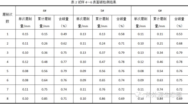 共對(duì)6個(gè)試樣進(jìn)行了8次磨削及表面碳含量的檢測(cè)。各試棒的單次磨削量、累計(jì)磨削量及相應(yīng)的表面碳含量記錄見表1、表2。