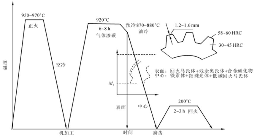 (1)低碳 為了保證滲碳零件心部具有足夠的塑性和韌性,合金滲碳鋼的碳含量一般為ωC=0.1%~0.25%