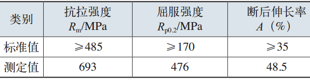 采用電子萬能試驗機,在盤管上取樣進(jìn)行拉伸試驗,結(jié)果見表2。試樣斷口形貌為塑性斷裂。通過對比可知,材料的抗拉強度、屈服強度和斷后伸長率均符合ASME SA213標(biāo)準(zhǔn)。