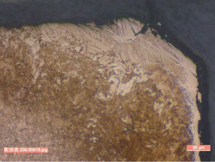 (1)該批配油盤尖角棱邊處氮化物超標,造成脆性嚴重,需報廢處理。(2)滲氮前零件表面不允許存在脫碳層,原材料檢驗過程中,應嚴格控制原材料脫碳層深度,不得超過后續加工余量的1/3。(3)各工序加工過程中應加強自檢,冷加工和熱加工工序間應加強溝通。作者:趙曉秀,劉愛龍,孟凡濤,楊同光