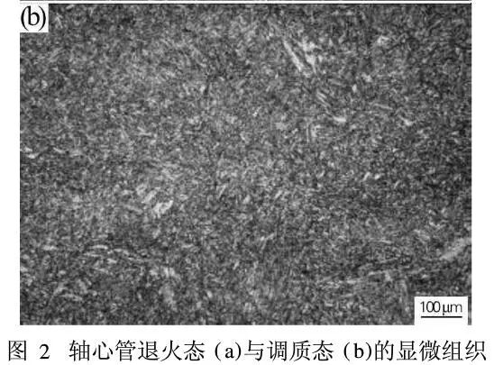 3)選擇合理淬火工藝,減小組織應(yīng)力和熱應(yīng)力。適當降低淬火加熱溫度,并將淬火油溫提高到90℃左右,同時,也縮短軸心管在淬火油中的停留時間。
