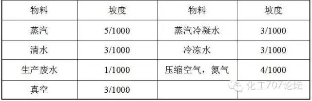管道敷設應有坡度,坡度方向一般均沿著物料流動方向,但也有與物料流動方向相反的。坡度一般為1/100~5/1000。輸送黏度大的物料管,坡度要求大些,可至1/100。含固體結晶的物料管道坡度可至5/100左右。埋地管道及敷設在地溝中的管道,在停止生產(chǎn)時,其積存物料不考慮放盡,可不考慮敷設坡度。