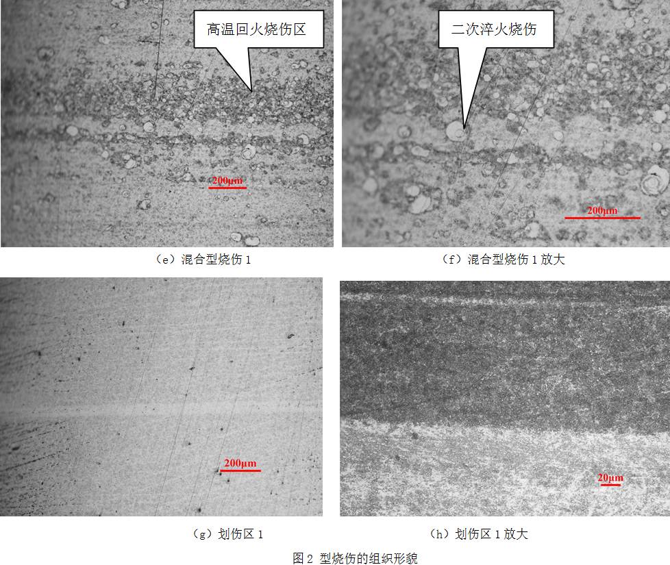 (2)酸洗顏色異常的區(qū)域系發(fā)生嚴重的摩擦的塑形變形,由于磨擦熱導致高溫回火,發(fā)生了組織的變化;嚴重者發(fā)生了二次淬火燒傷層,但也有介于這兩種之間的混合性組織形貌,而正常區(qū)域的馬氏體組織均為3級,屬于合格控制級別。