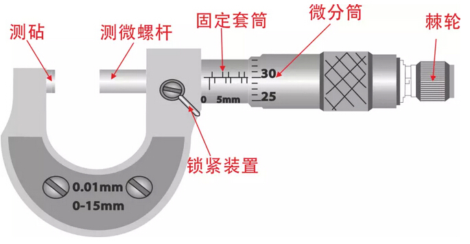 外徑千分尺 常簡稱為千分尺,它是比游標(biāo)卡尺更精密的長度測量儀器,常見的一種如上圖所示,它的量程是0-25毫米,分度值是0.01毫米。外徑千分尺的結(jié)構(gòu)由固定的尺架、測砧、測微螺桿、固定套管、微分筒、測力裝置、鎖緊裝置等組成。固定套管上有一條水平線,這條線上、下各有一列間距為1毫米的刻度線,上面的刻度線恰好在下面二相鄰刻度線中間。微分筒上的刻度線是將圓周分為50等分的水平線,它是旋轉(zhuǎn)運動的。