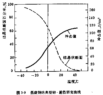 低碳鋼典型的韌-脆性轉(zhuǎn)變溫度。隨著溫度的降低,材料的沖擊值下降,同時在斷裂面上的結(jié)晶狀斷面部分增加,亦即材料的韌性降低,脆性增加。