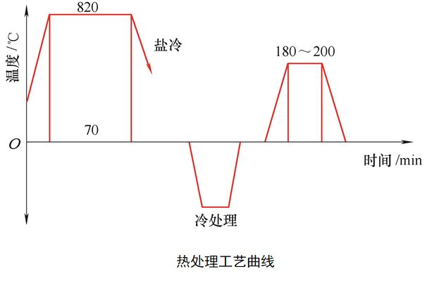 試驗采用愛協林鹽淬多用爐,淬火工藝采用820℃保溫75min出爐鹽浴淬火,鹽浴溫度為170℃,等溫時間50min。隨后采用不同的回火及冷處理溫度進行處理,工藝曲線及具體工藝方案如附圖及表2所示。