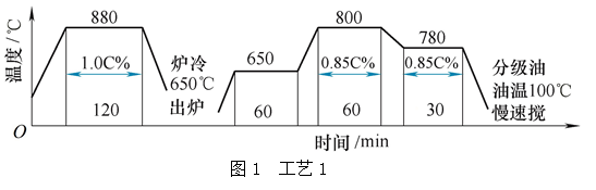 工藝1曲線如圖1所示,使用設(shè)備是天龍生產(chǎn)的多用爐,型號(hào)為RM9-75/130/75-5-TL。淬火冷卻介質(zhì)使用北京華立精細(xì)化工公司今禹等溫分級(jí)淬火油,型號(hào)Y35-Ⅱ。