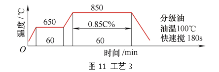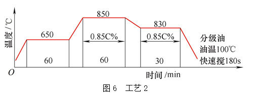 工藝1曲線如圖6所示,使用設(shè)備為天龍生產(chǎn)的多用爐,型號(hào):RM9-75/130/75-5-TL。淬火油使用的是北京華立精細(xì)化工公司今禹等溫分級(jí)淬火油,型號(hào)Y35-Ⅱ。