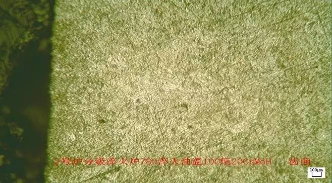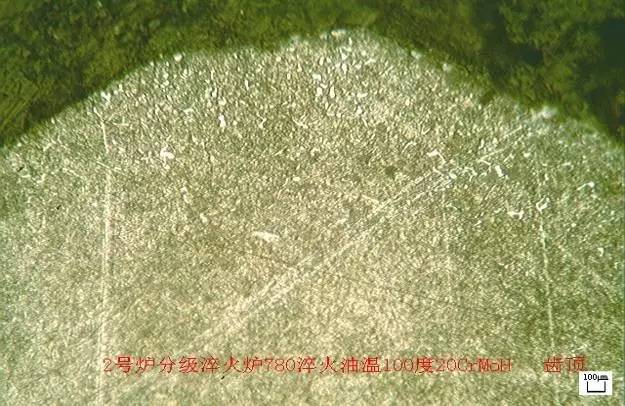 在此之前我們?cè)?jīng)在分級(jí)油中試驗(yàn)過模數(shù)為3~3.5mm的行星輪,工藝為強(qiáng)滲溫度900℃,淬火溫度為800℃,結(jié)果都能滿足客戶要求,故在生產(chǎn)模數(shù)為1.72mm的太陽輪時(shí)為了在滿足產(chǎn)品圖要求的同時(shí)進(jìn)一步減小熱處理變形,將淬火溫度降至780℃后,結(jié)果出現(xiàn)了第三段中所述的問題。