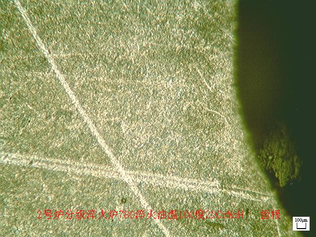 經(jīng)過此次生產(chǎn),我們認(rèn)為小模數(shù)滲碳淬火產(chǎn)品,淬火溫度的控制應(yīng)謹(jǐn)慎,不能一味的為滿足心部硬度而降低淬火溫度,一定要考慮小模數(shù)產(chǎn)品出爐過程中由于結(jié)構(gòu)的原因溫降過快對(duì)心部硬度和組織的影響。