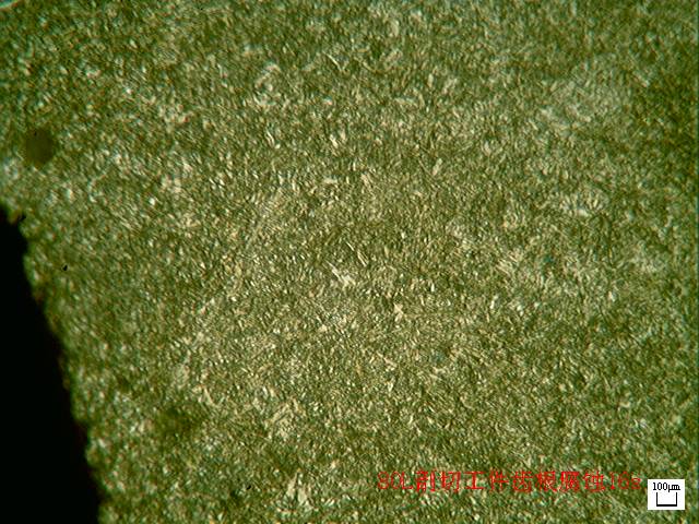 新工藝結(jié)果:心部為板條馬氏體加少量的貝氏體組織如圖12所示;齒面為馬氏體組織如圖13所示,三級(jí);齒頂碳化物1級(jí),為彌散顆粒狀碳化物如圖14所示;齒根為馬氏體組織如圖15所示,三級(jí),心部硬度43HRC,結(jié)果完全符合外商的要求。