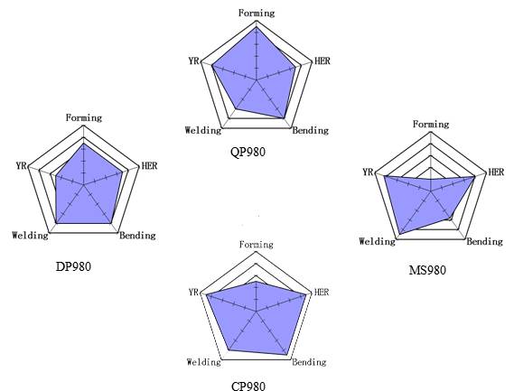 超高強鋼的使用性能主要涉及五個方面:Forming成形性能YR屈強比Welding焊接性能; Bending彎曲性能; HER擴孔性能。