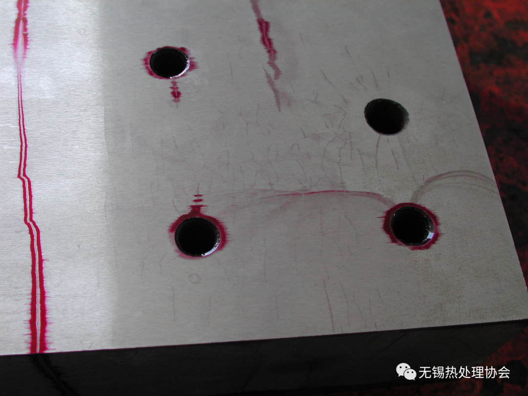 Cr12MoV鋼模板在磨削加工過程中磨面出現(xiàn)了裂紋,磨削表面有明顯的褐色振紋焦斑,見圖1,經(jīng)著色探傷顯示,沿孔周圍有放射狀裂紋及細(xì)小網(wǎng)絡(luò)狀裂紋,見圖2。模板的設(shè)計(jì)要求如下:規(guī)格為580mm*210mm*50mm,材料為Cr12MoV鋼,馬氏體級別<3級,硬度60-64HRC;加工工藝路線為:原材料→下料→機(jī)械加工→真空淬火+回火→磨削加工→線切割加工→鉗工修整;真空熱處理工藝為650℃預(yù)熱90min, 820℃預(yù)熱90min,升至1020℃開始保溫,保溫時(shí)間60min。預(yù)冷淬靜油(60-80℃),油中冷卻15分鐘出油;180℃×3h二次回火。筆者就模板的開裂原因進(jìn)行了分析,并提出了相應(yīng)的改進(jìn)措施。