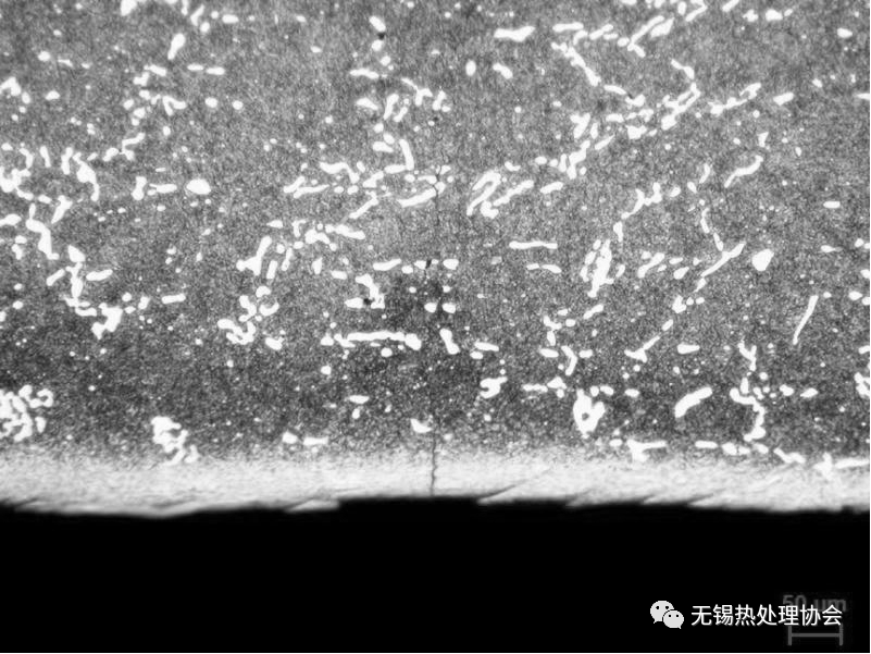 圖5 二次淬火層、回火燒傷層及表面裂紋形貌 100X
