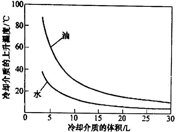 ▲圖1  1kg鋼自850℃冷卻到100℃時,冷卻介質體積與溫升的關系